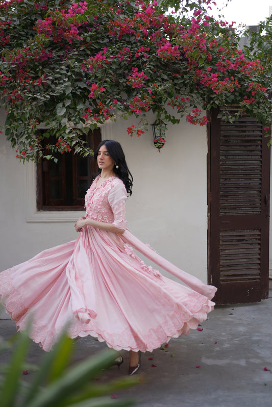 Product Description:Pink petalA refined pink flair pishwas, intricately adorned with floral appliqué, hand-set pearls, crystals,...