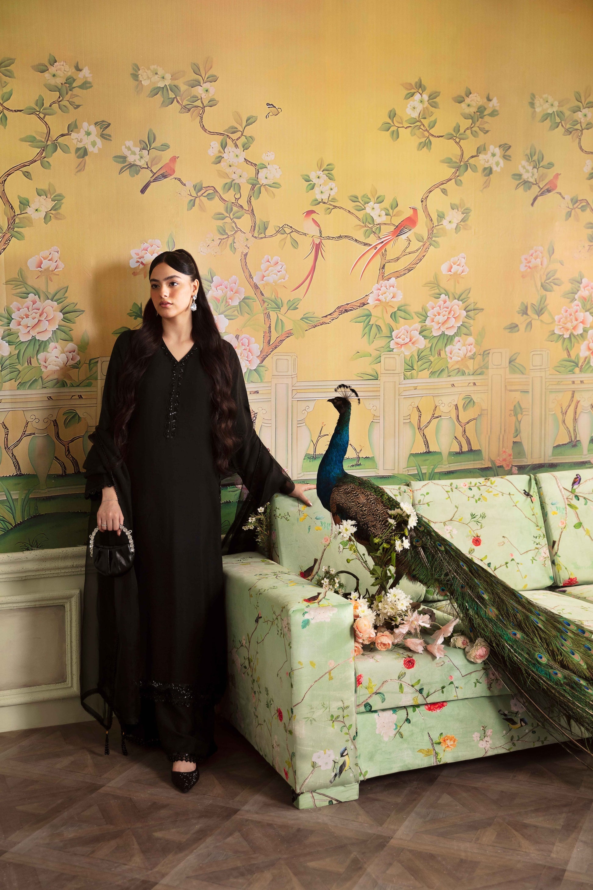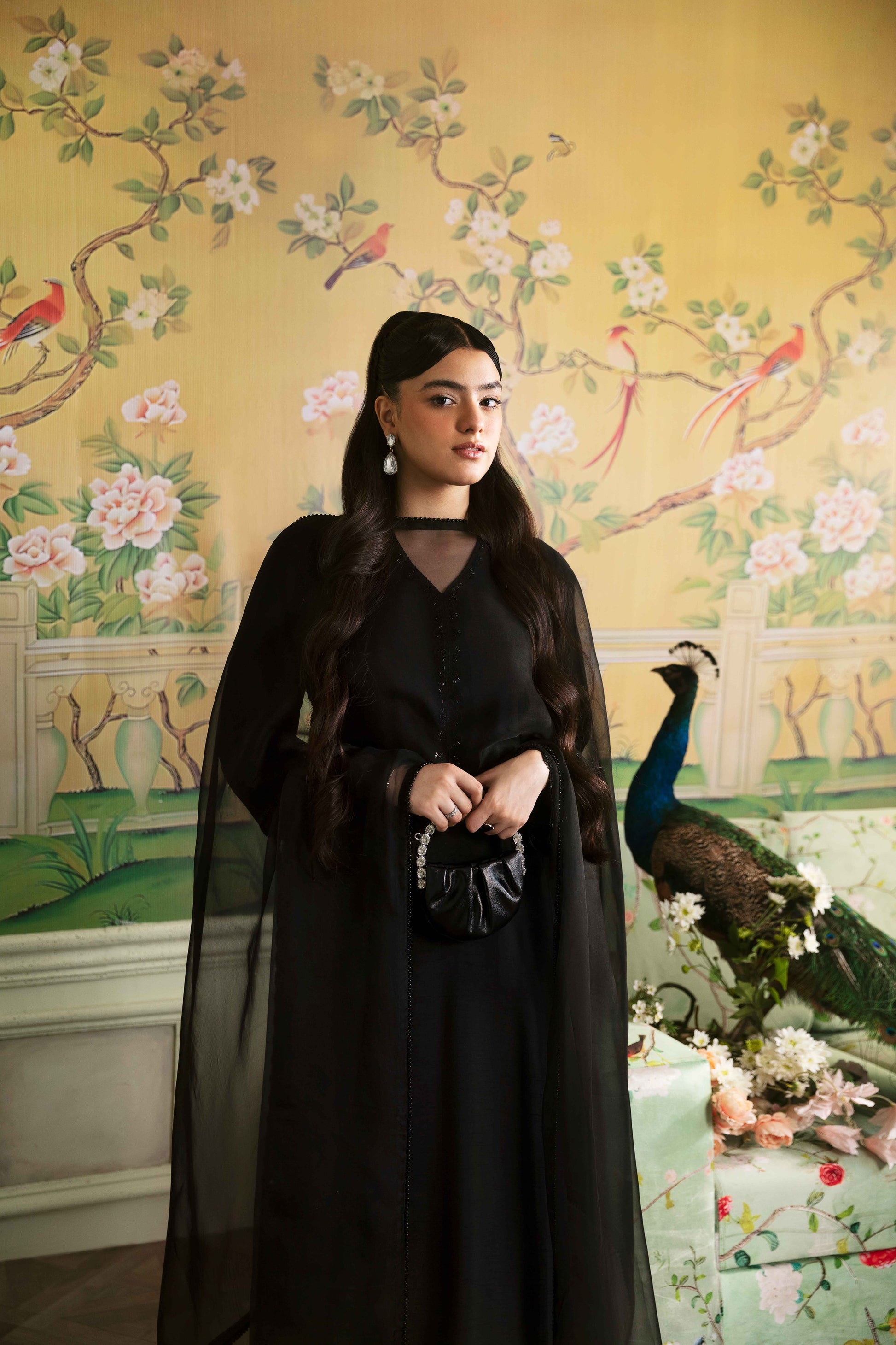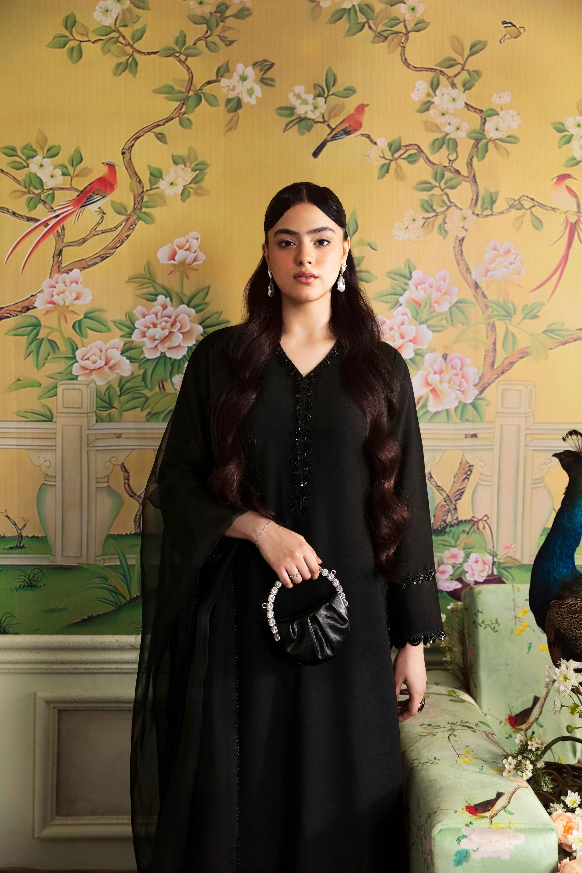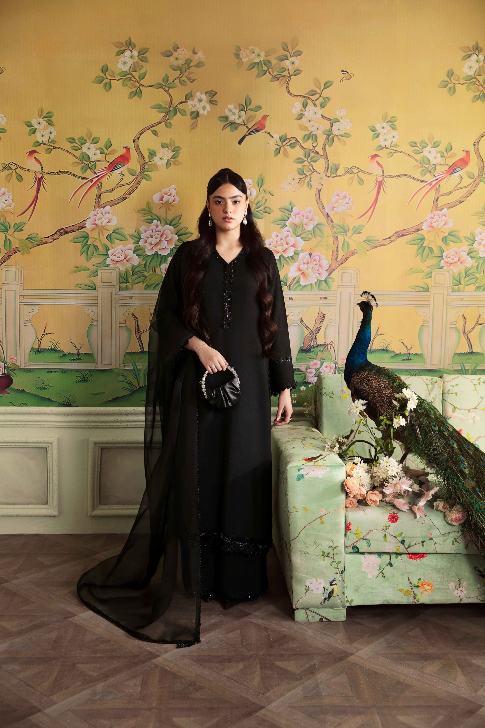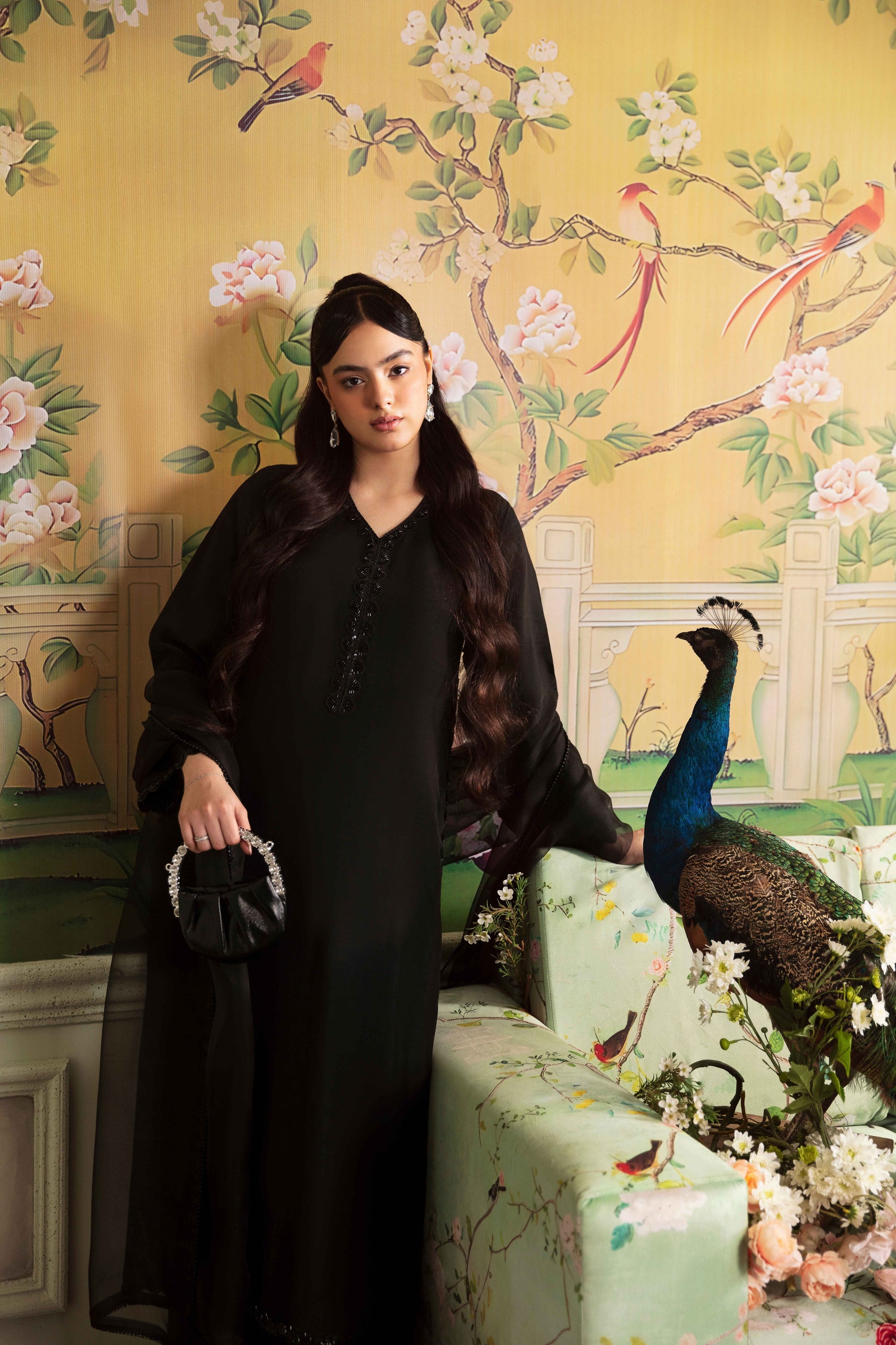 The shirt with a jewelled neckline and sleeves adorned with beautiful crystals and pearls delicately adoring the sides and daman radiates elegance and luxury.