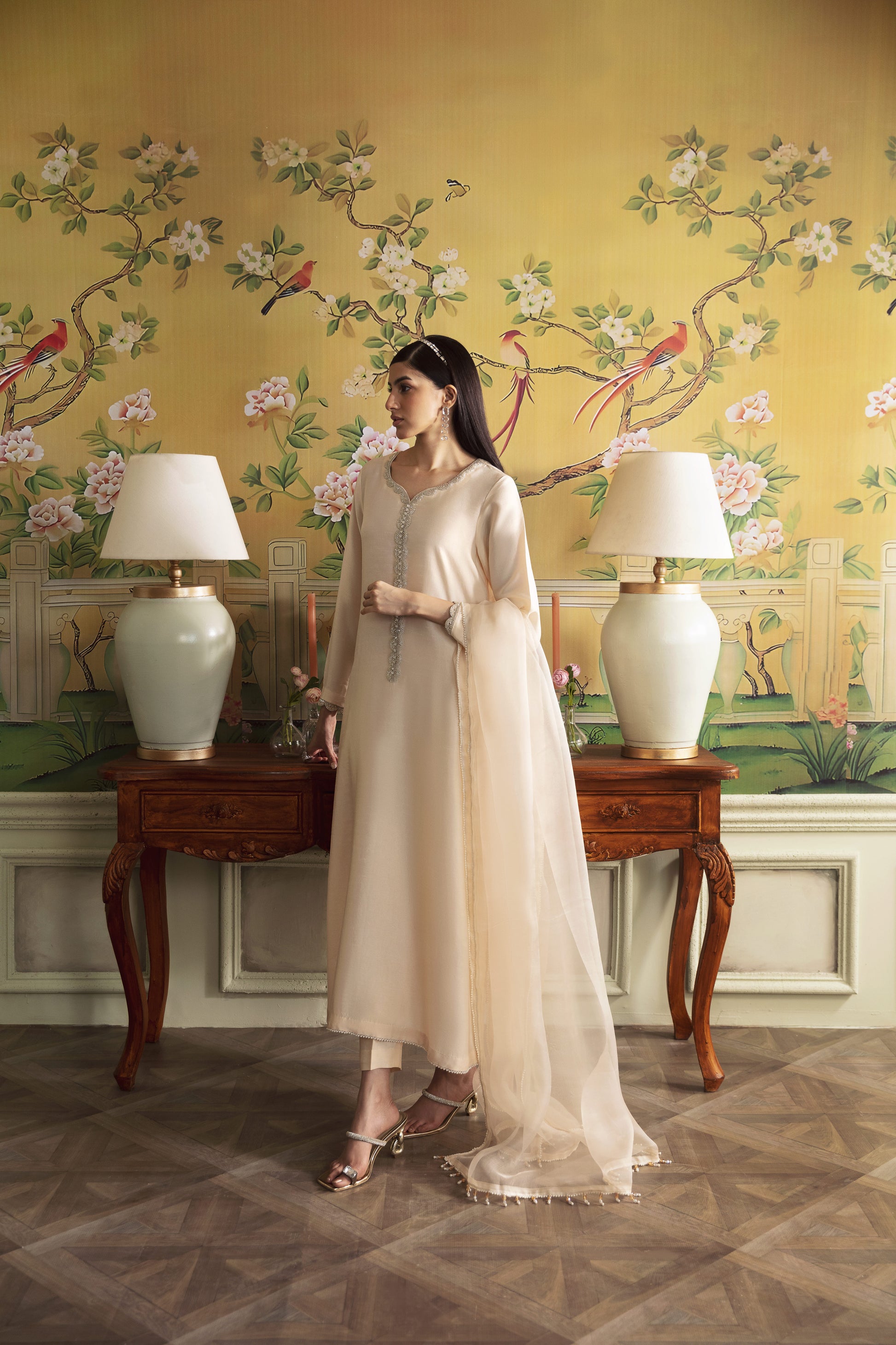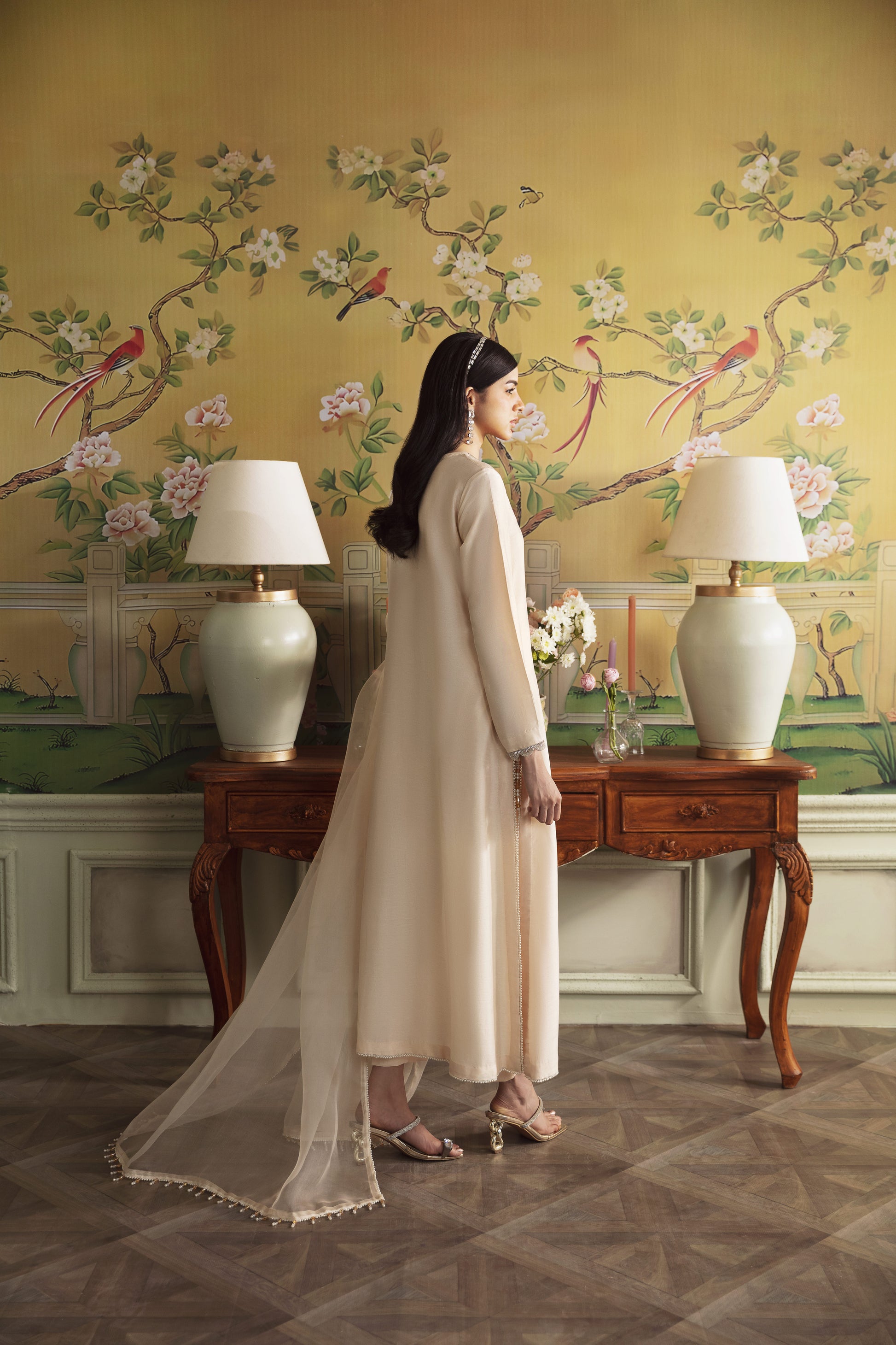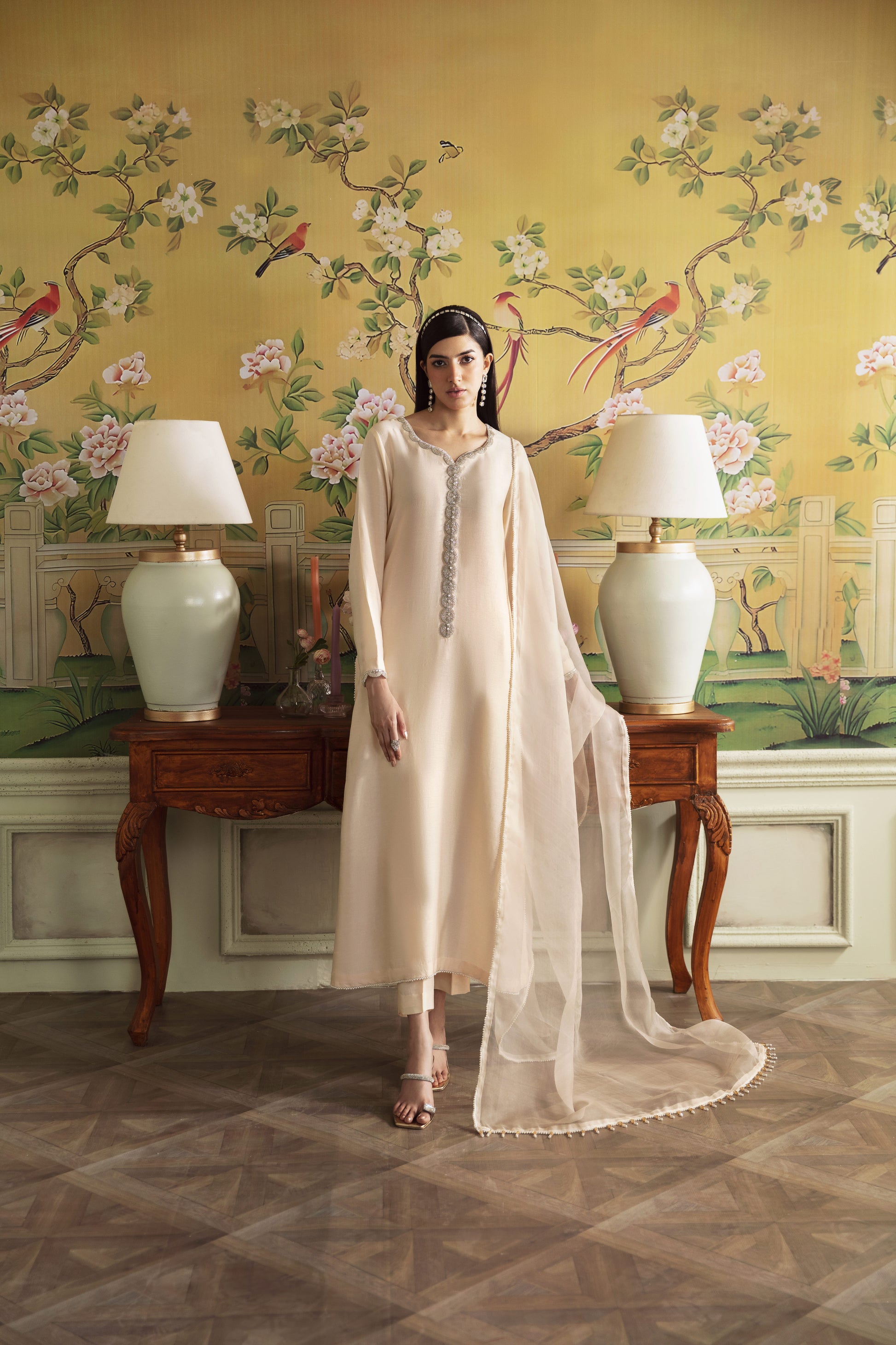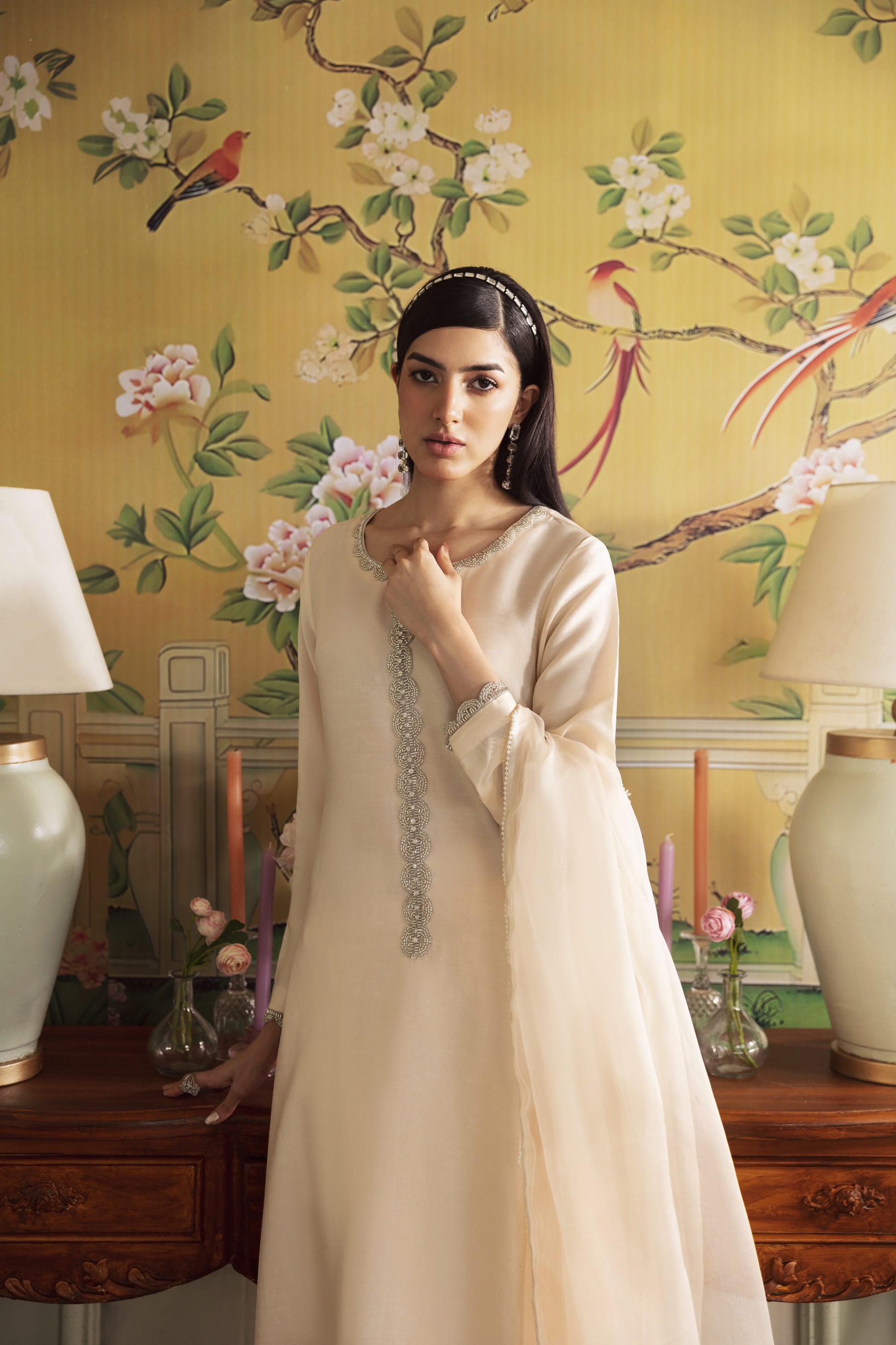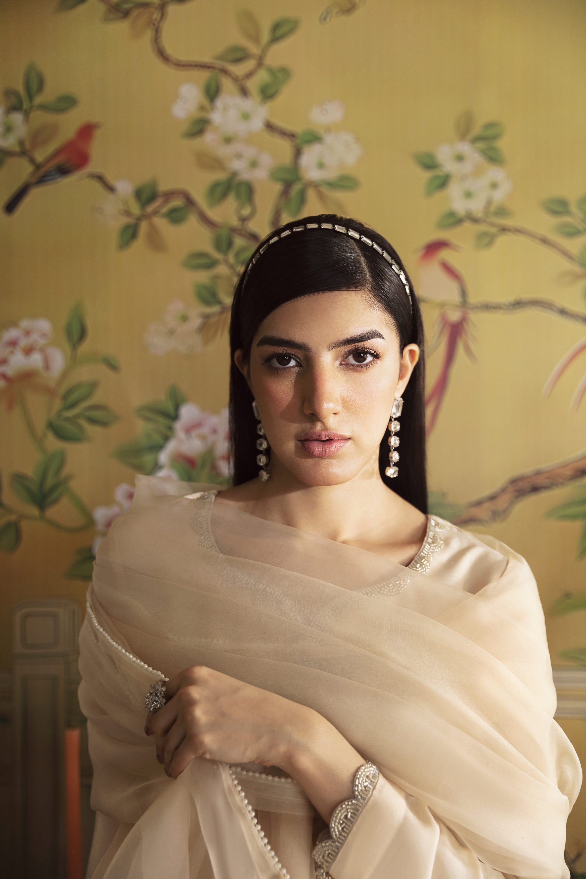 The shirt with a jewelled neckline and sleeves adorned with beautiful crystals and pearls delicately adoring the sides and daman radiates elegance and luxury.