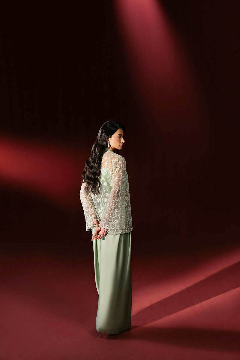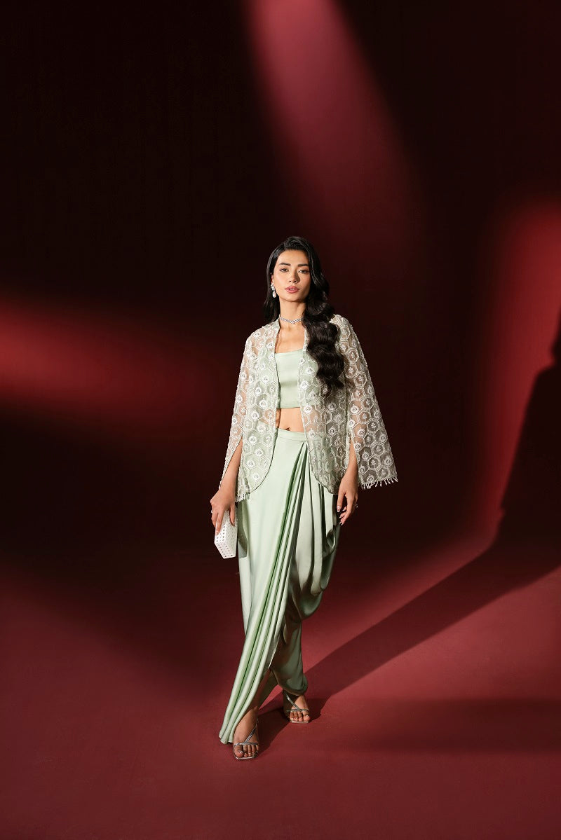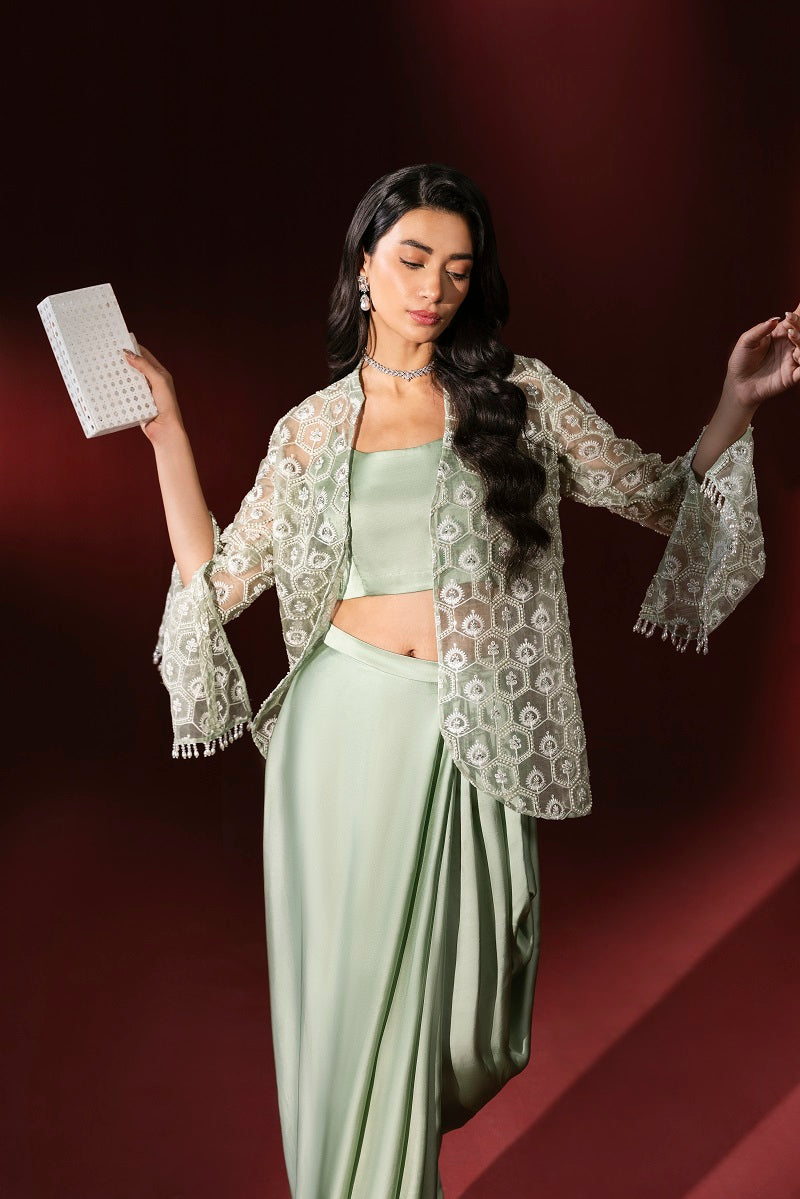 The Elara Ensemble is a stunning three-piece set featuring a fully embroidered pure organza jacket adorned with pearls, sequins, and crystal-pearl tassels on the sleeves. Paired with a flowing draped waterfall skirt and a sleek charmeuse tube top, this luxurious outfit exudes elegance. Perfect for galas or weddings, Elara combines intricate craftsmanship with timeless sophistication for an unforgettable look.