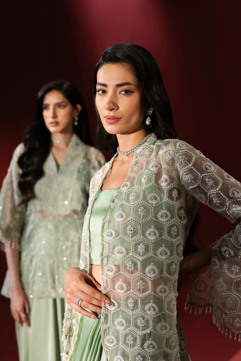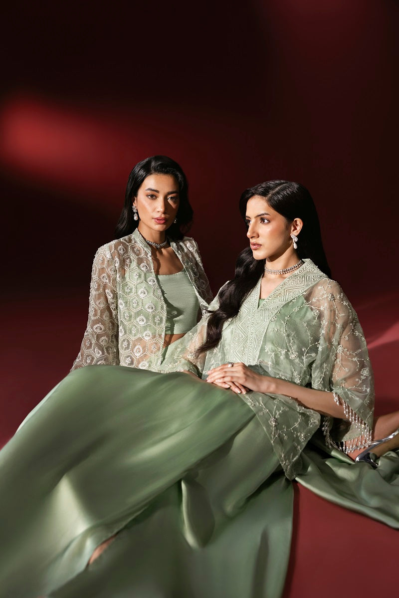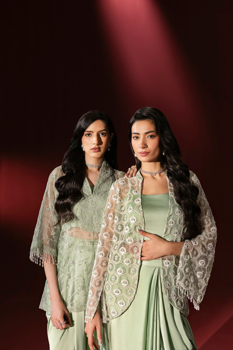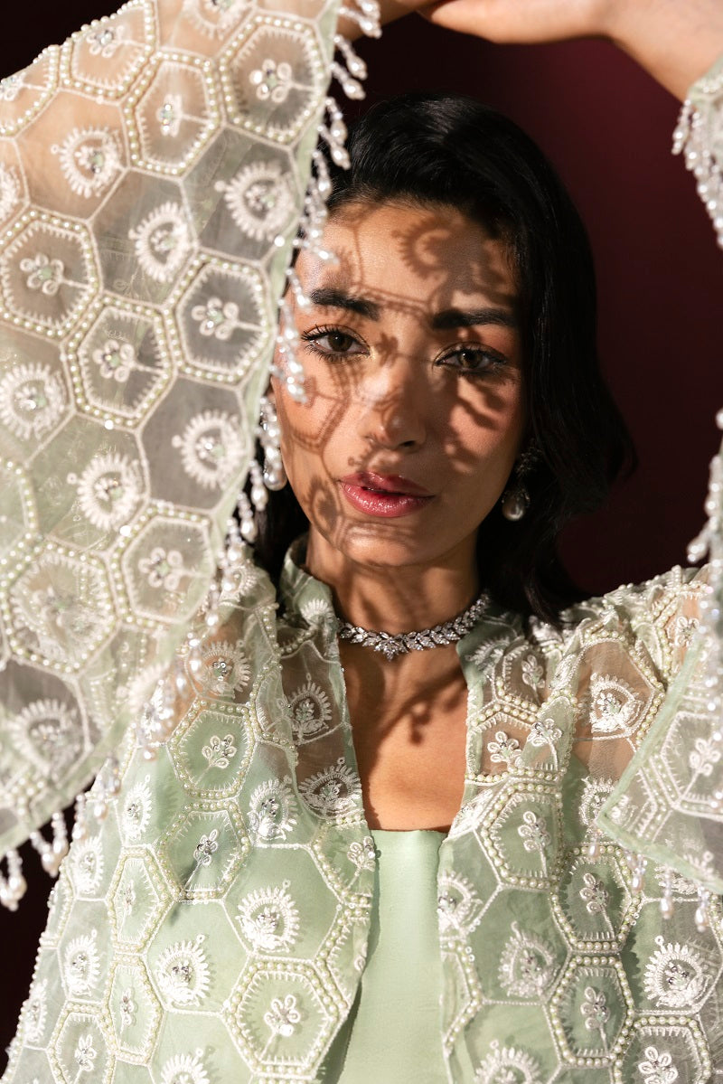 The Elara Ensemble is a stunning three-piece set featuring a fully embroidered pure organza jacket adorned with pearls, sequins, and crystal-pearl tassels on the sleeves. Paired with a flowing draped waterfall skirt and a sleek charmeuse tube top, this luxurious outfit exudes elegance. Perfect for galas or weddings, Elara combines intricate craftsmanship with timeless sophistication for an unforgettable look.