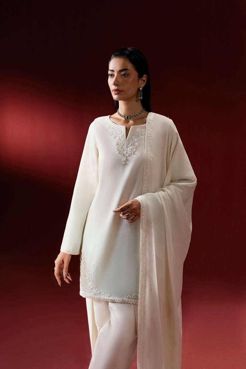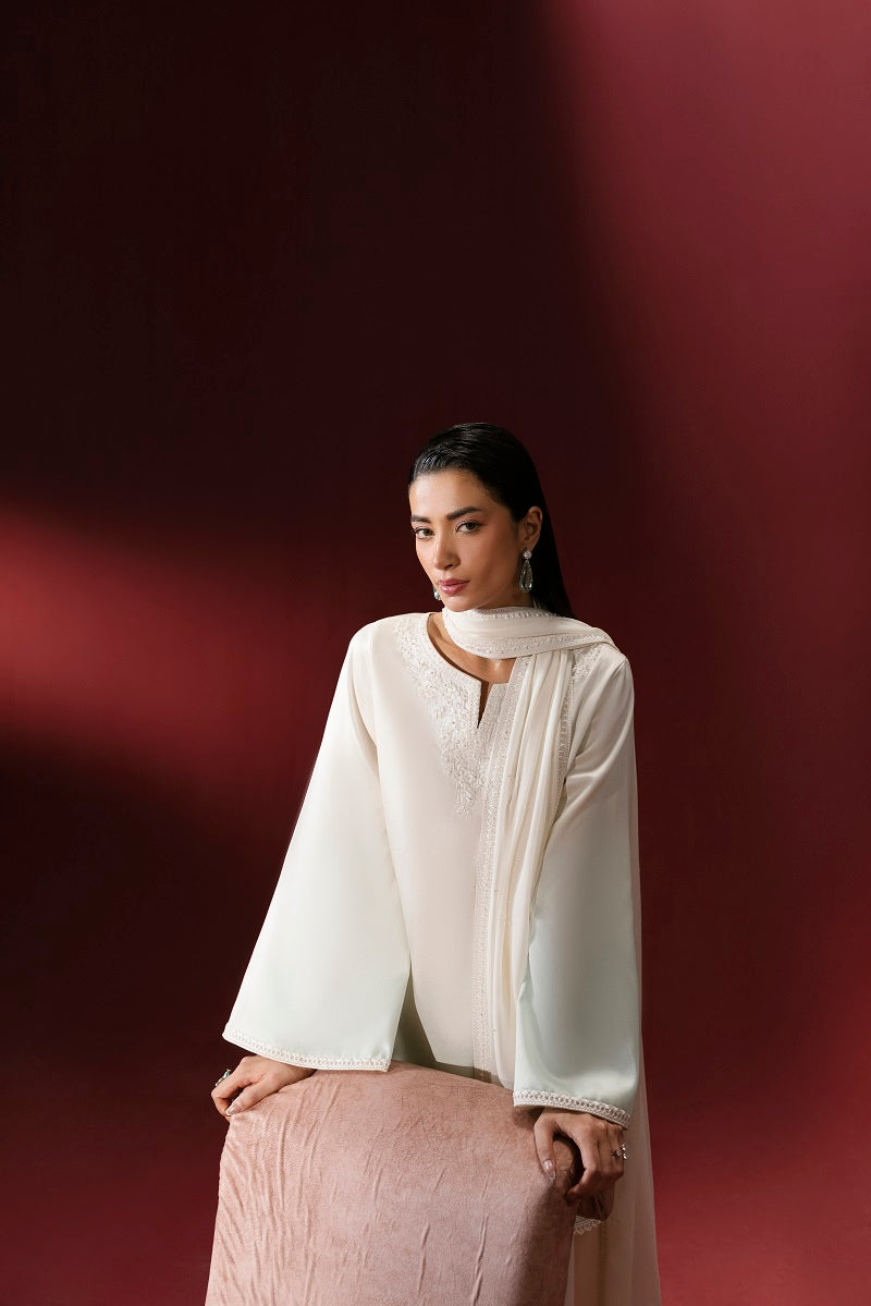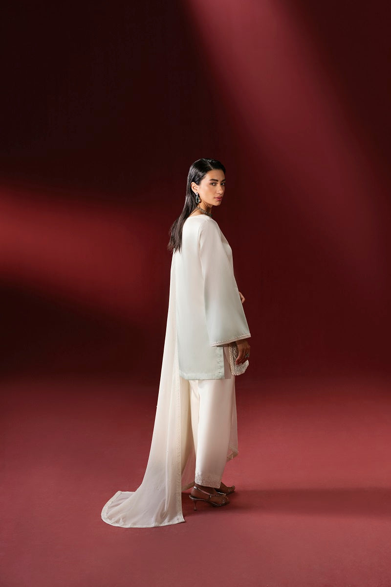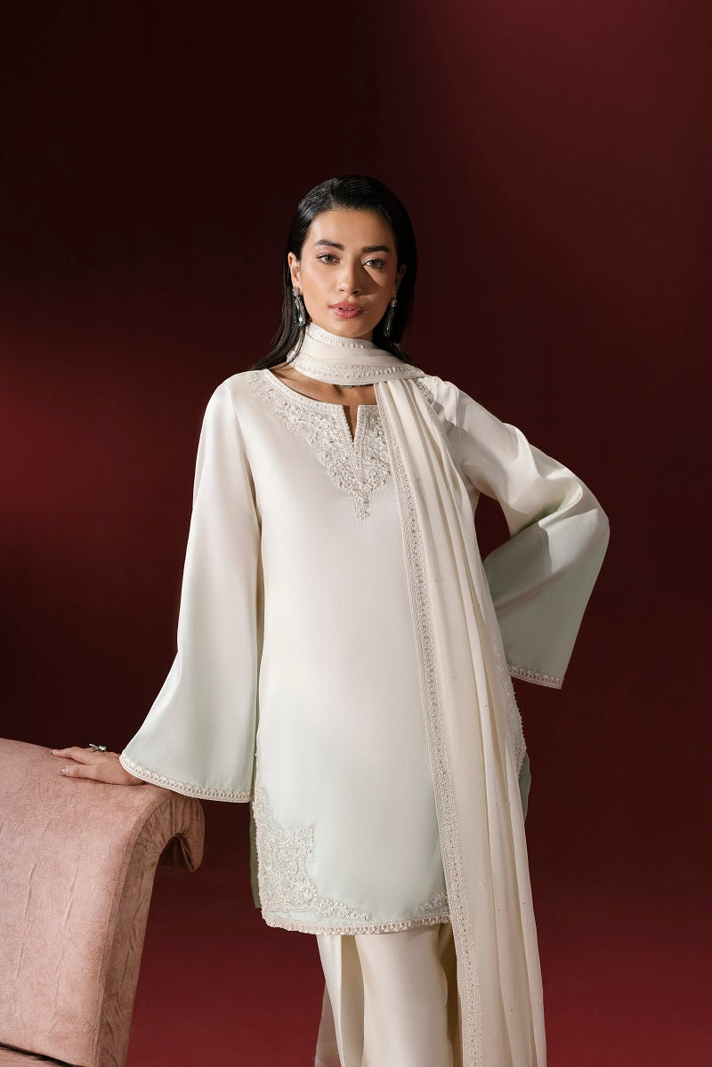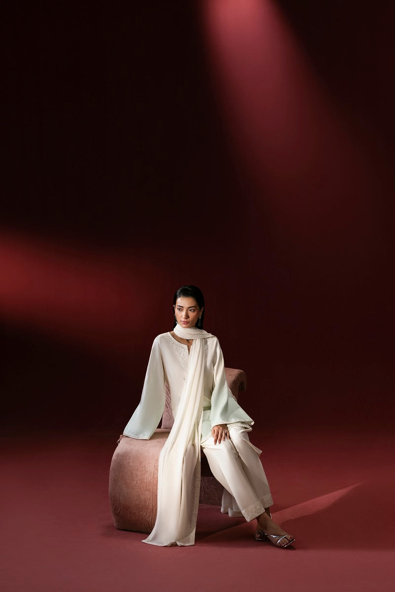 Celestia is crafted from pure silk, featuring a dreamy off-white shirt that melts into an ombré finish. The neckline, sleeves, and daman boast exquisite embroidery, adorned with pearls, cut dana,crystal and sequins for a touch of elegance. Paired with a sleek pure silk tapered shalwar and a pure chiffon dupatta finished with embroidered Patti embellished with pearls and sequins , its timeless sophistication.