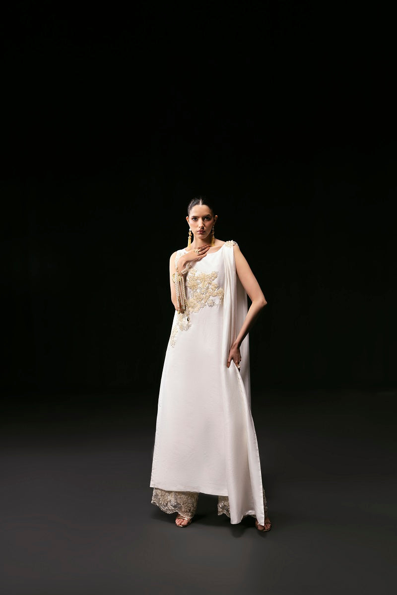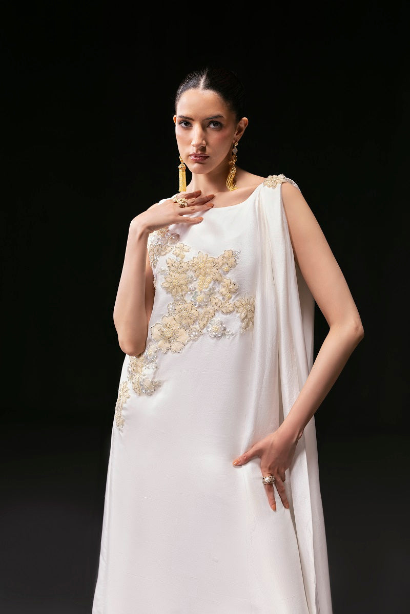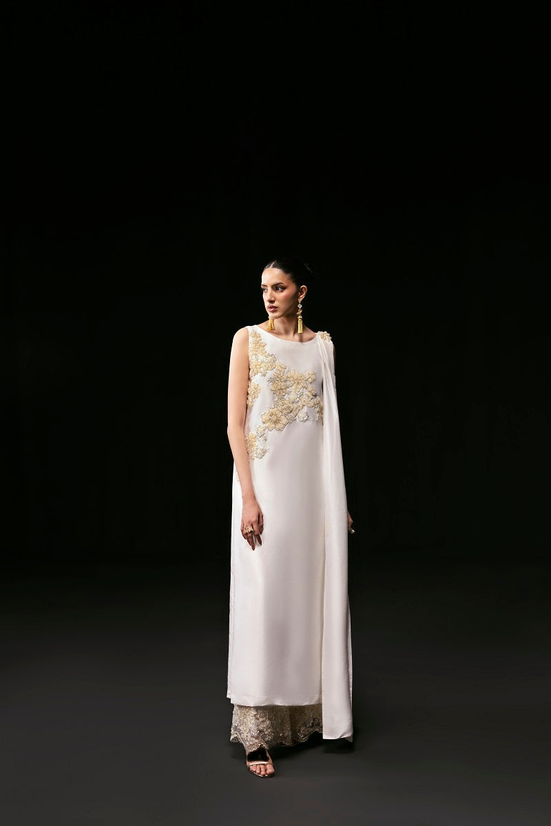 The Opal dress is a stunning full-length pure raw silk shirt adorned with intricate floral motifs, embellished with sequins, beads, and pearls. Featuring a stylish side cut and a gracefully draped raw silk stole around the neckline, it pairs elegantly with pure raw silk pants, detailed with exquisite embroidered lace, sequins, and adda work for a luxurious, timeless look.