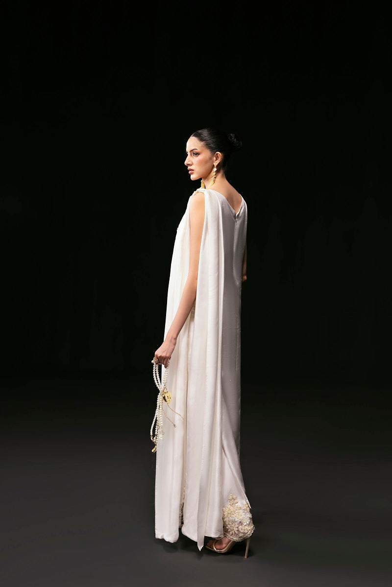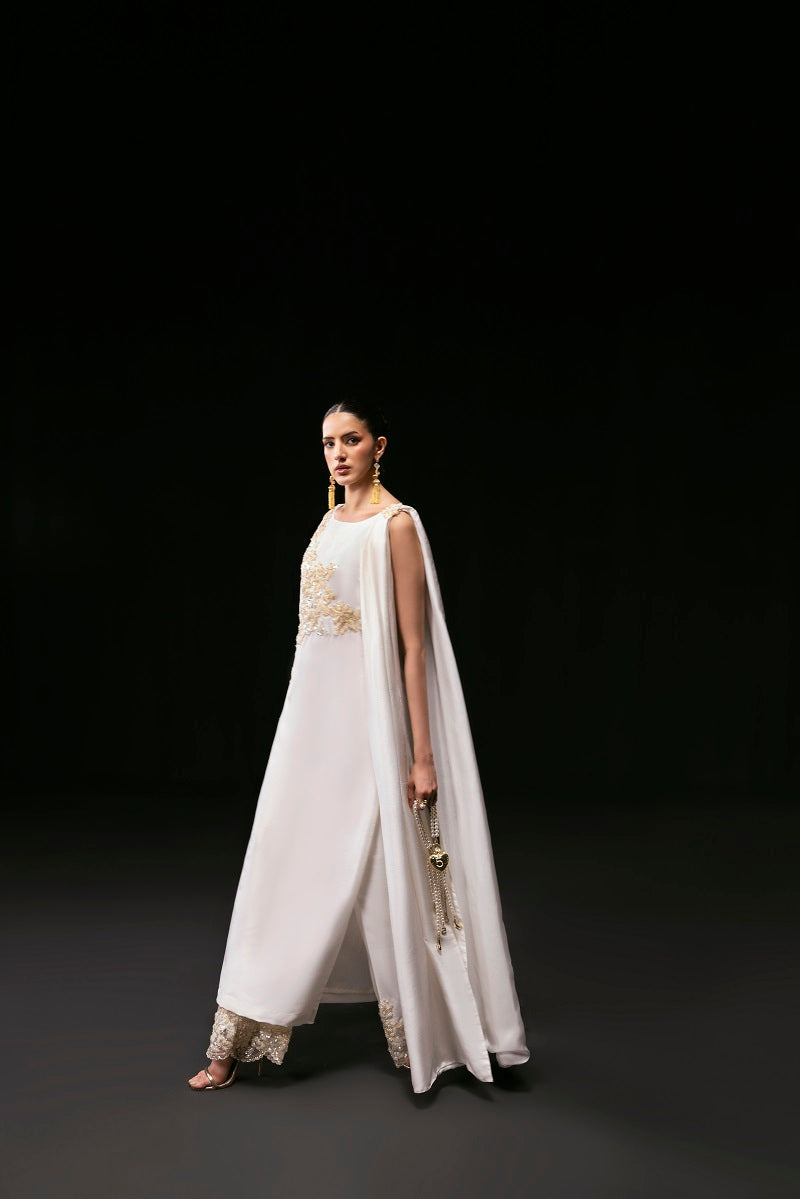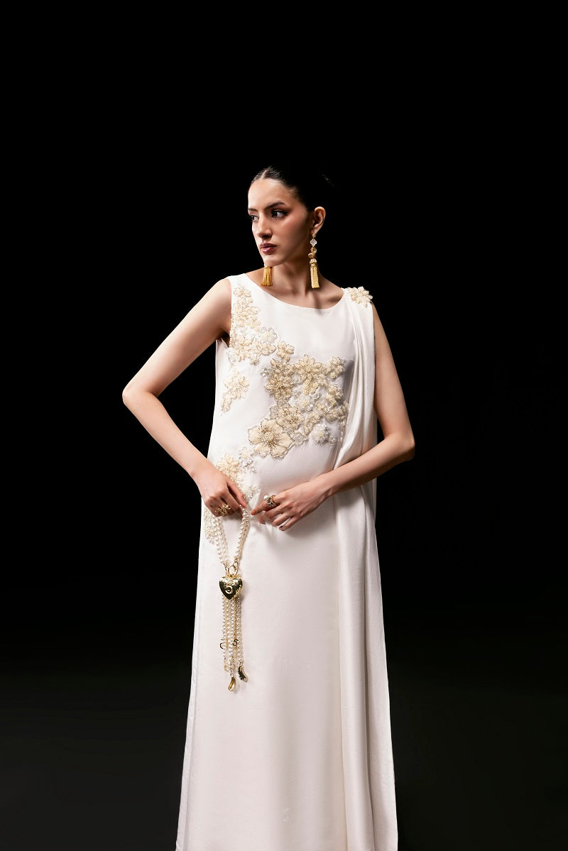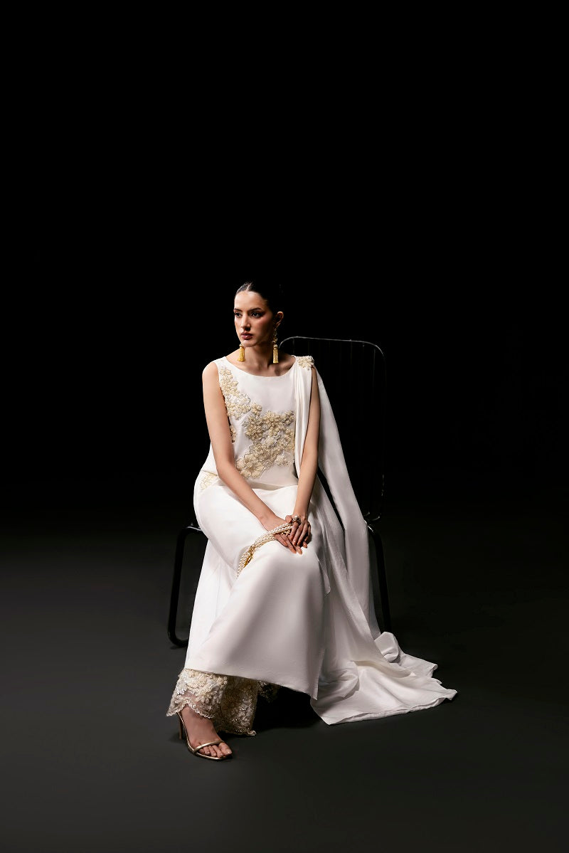 The Opal dress is a stunning full-length pure raw silk shirt adorned with intricate floral motifs, embellished with sequins, beads, and pearls. Featuring a stylish side cut and a gracefully draped raw silk stole around the neckline, it pairs elegantly with pure raw silk pants, detailed with exquisite embroidered lace, sequins, and adda work for a luxurious, timeless look.
