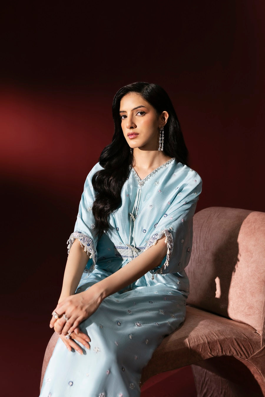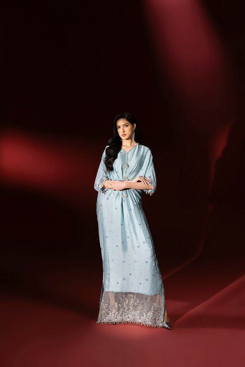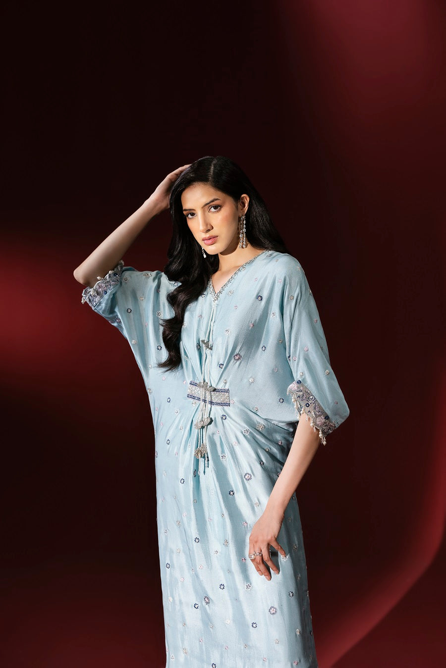 Dress Swan Kaftan Discover timeless elegance with the Dress Swan, a classic kaftan made from pure embroidered silk. Adorned with intricate pearls, sequins, and exquisite Adda work, it features delicate tassels on the sleeves, daman, and neckline for added charm. Perfect for special occasions, this handcrafted masterpiece offers luxurious comfort and sophistication, ensuring you shine with every graceful step.